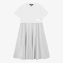 A black and white cotton jersey dress set for teen girls by DKNY, cool for an eclectic streetwear look. In a monochromatic design, the split hem sweatshirt has a graffiti print and distinctive logo badges on both sides. Creating two looks in one, the top can be worn separately or layered over the racerback dress, which has logo-jacquard straps.