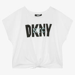 Teen girls black organic cotton T-shirt by DKNY, inspired by the brand's New York based history. Instantly recognisable, it has a bold pink logo print across the front with 'NYC' in contrasting white. Cool and cropped, the hem is tied into a knot for a streetwear inspired finish.