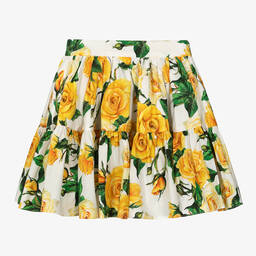 Mini-me white skirt for girls by luxury Italian brand Dolce & Gabbana. Made in soft, smooth cotton poplin, it is patterned with a multicoloured patchwork design. Lined in lightweight cotton, it has a sparkly blue and gold waistband. It fastens with a zip on the side and has a useful, adjustable waist.