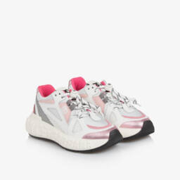 Boys white and grey trainers by Dolce & Gabbana offer a blend of style and comfort. Crafted with premium leather, mesh, and metallic silver panels, these trainers feature distinctive logo detailing and a convenient toggle lacing system for easy wear. The robust rubber sole ensures excellent grip and support, making them perfect for active days. Limited quantities available, so seize the chance to add these exclusive trainers to a collection.