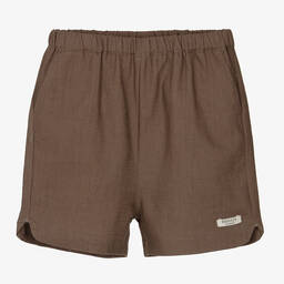Boys beige linen shorts by Donsje are handmade in lightweight linen for a comfortable and casual look. Featuring an elasticated waistband for easy dressing, these shorts have slanted front pockets, faux back pockets, and an embroidered logo patch on one leg for a designer finish. Perfect for warm weather, these shorts are available in limited quantities, making it a last chance to buy this stylish piece.