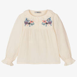 Pink and white check blouse for younger girls by Dr. Kid, in a lightweight polycotton seersucker. It has a lovely ruffle collar with a neon pink bow, and matching ruffles on the shoulders. A pleat on the front gives an A-line shape and there is a single button fastening on the back.