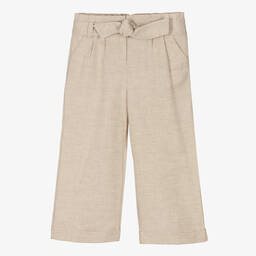 White linen blend trousers for girls by Dr. Kid. They have a paper bag waist and a wide leg cut for a beautiful shape. For simple dressing, they fasten with a zip and button on the front and have a sash belt that can be bowed for a pretty finish.