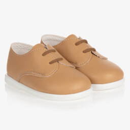 Boys beige first walker shoes for little boys by Early Days. Crafted with soft faux leather and a textile lining, these shoes feature lace fastenings for a classic look. Supporting developing feet, they include a lightly cushioned insole and a flexible non-slip outsole. Perfect for early steps, these shoes offer comfort and style. Limited quantities available, so act fast to secure this essential addition to any wardrobe.