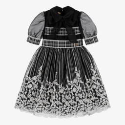 A lilac organza dress for girls by Elie Saab, featuring beautiful striped and floral embroidery, is a perfect choice for special occasions. The dress boasts a charming fixed bow at the neckline and elegant, full puffed sleeves with tulle lining to add volume. Designed with tulle underskirts and a double lining, it creates a full silhouette. A gold metal logo charm on the waistband adds a sophisticated touch. Last chance to buy this exquisite piece, available in limited quantities.