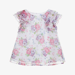 Elegant white floral cotton blouse for girls by Elie Saab, softly woven in lightweight fabric. This beautiful blouse features a Toile-du-Jouy-inspired design, wide three-quarter-length sleeves, and a pointed collar. The stylish boxy silhouette makes it perfect for both casual and special occasions. Limited quantities available – last chance to buy!