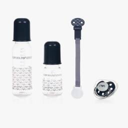 Boys four-piece baby bottle set by Emporio Armani. Included in the set are two different sized bottles with blue logo branding and matching caps. The bottles are shatterproof and easy grip, with silicone teats. Also included is a blue pacifier and dummy clip.