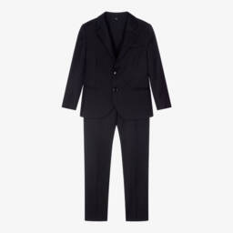 Classic black suit for boys by Italian brand Emporio Armani, impeccably tailored in lightweight virgin wool. The single-breasted jacket is styled with a tonal, rubberised Eagle logo on the notched lapel, double vents on the back, a handkerchief pocket and welt pockets on the front. It has silky lining patterned with tiny Eagle logos and branded button fastenings. The trousers fasten with a zip and button and have smart pockets on the front and back.