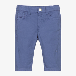 Green trousers for little boys by Emporio Armani, made in soft cotton. They have five useful pockets and a silver Eagle logo badge on the back. Fastening with a single popper, they have a convenient adjustable waistband.