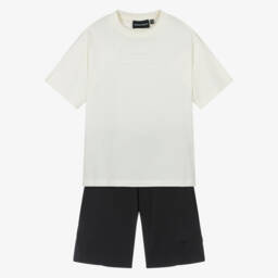 The boys ivory and beige logo shorts set by Emporio Armani offers a blend of luxury and style. Crafted from soft cotton jersey, the light beige T-shirt features an elegant embroidered logo, while the dark beige shorts boast a comfortable stretchy waistband and a chic faux drawstring. With a practical back pocket and an embroidered Eagle logo, it's perfect for casual outings or summer gatherings. Limited quantities available, making it a must-have addition to any wardrobe.