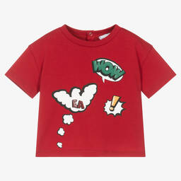 Fun navy blue T-shirt for little boys by Emporio Armani, with comic style logo prints and 'wow' printed on the front. Made in soft and comfortable cotton jersey, it fastens easily with branded poppers on the back. This item contains organic and recycled fibres.