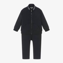 Boys pale blue jersey tracksuit by Emporio Armani offers a chic and comfortable style. Crafted from a soft cotton blend, it features a zip-up top with a distinctive intarsia logo on the collar and a branded zip puller, providing a snug fit. The elasticated waistband on the joggers adds practical ease. Suitable for casual outings, this set is a last chance to buy with limited quantities available.