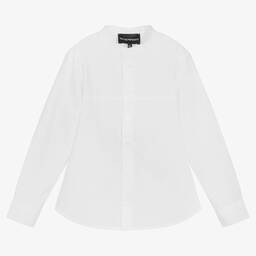 Ideal for those special occasions, this off-white cotton shirt for boys is by Emporio Armani. Made in lightweight poplin, this ceremony piece has a collarless design and smart pintucks down the front. There is a small Eagle logo embroidered just above the hem, for an understated yet recognisable designer touch.