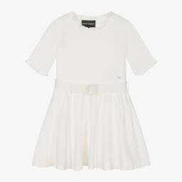 Girls pink knitted dress by Emporio Armani is a lovely pale pink dress for girls, knitted in a soft and comfortable viscose blend. A stylish fit and flare design, it has a ribbed bodice with pretty frilled edges on the neckline and short sleeves. The waist is cinched with a matching knitted belt and the label's distinctive Eagle logo can be seen just above for a subtle designer touch. Limited quantities available, last chance to buy.