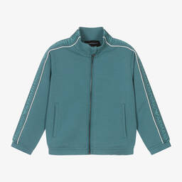 Teen boys green cotton zip-up top by Emporio Armani offers a sporty designer look with tonal jacquard logo tape on each long sleeve and shoulder, accented by white piping trims. Crafted in super soft, mid-weight cotton blend jersey, it features front pockets and a zip fastening with a useful chin guard. Ideal for layering, this top is perfect for casual outings or sporty activities. Last chance to buy, with limited quantities available.