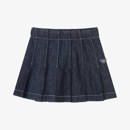 This dark blue chambray skirt for teen girls by Emporio Armani closely resembles denim and features an elasticated waist with a pleated silhouette. The iconic Eagle logo patch is a subtle designer detail, adding a unique touch to the lightweight cotton and linen blend fabric. Ideal for casual wear, this skirt is perfect for everyday comfort and easy style. Limited quantities available, so it's the last chance to buy.