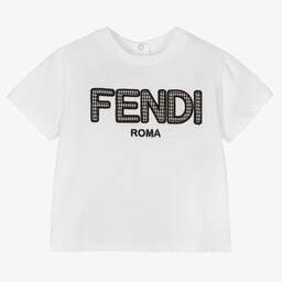 Light dusky blue T-shirt for baby boys by luxury Italian brand Fendi, made in soft cotton jersey. Making a designer statement, the front has a 'Fendi Roma' logo in mustard yellow and grey houndstooth check appliquéd letters. There are branded popper fastenings on the back for easy dressing.