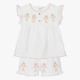 Adorable white pyjamas for girls from Flower Fairies™ by Childrensalon, embroidered with images taken from the original illustrations by Cicely Mary Barker. Ideal for a comfortable night’s sleep, they are made in luxurious cotton, blended with flame-retardant fibres free from harmful chemicals and brushed for extra softness. The top has a frilled collar with a pale pink picot trim and gently elasticated, puffed sleeves. It has pink piping down the front and glittery pink button fastenings. The trousers have an elasticated waist and frilled trims on the cuffs.