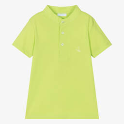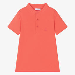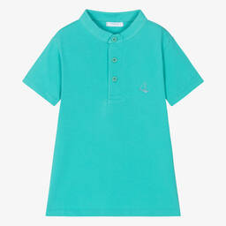 A cobalt blue polo shirt for boys by Spanish brand Foque, in soft and stretchy cotton piqué. A classic choice for smart-casual styling, this short-sleeved shirt has a collarless design with a neat button-up placket. The brand's signature sailing boat logo is embroidered on the chest.