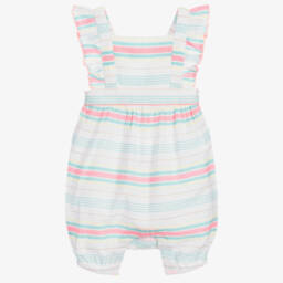 A delightful blue cotton lace frill playsuit for girls by Foque, featuring beautiful frilled sleeves with ivory embroidered lace trim and pleated detailing on the attached shorts. Fastening with a concealed zip on the back, it has pretty ties that can be secured into a sweet bow. Perfect for warm spring and summer days, this lightweight playsuit is available in limited quantities, so it's your last chance to buy.