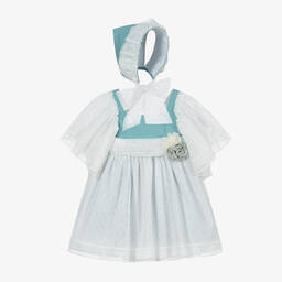 Exclusive to Childrensalon, a pale blue and white dress set for girls by Foque. Made in soft spotted tulle, with a lace edging and a double layer lining, it has a blue cotton and linen blend bodice, a removable tulle sash around the waist and a pink, ivory and blue flower brooch. The open back has a single button fastening and the matching bonnet has tulle ties.
