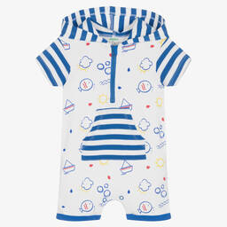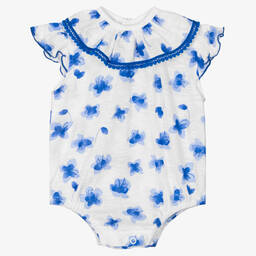 Pink cotton shortie for baby girls from FS Baby, made in soft jersey with a pretty pink floral pattern. This comfortable, sleeveless style has a ruffle collar with a glittery appliqué rose detail, and fastens easily with poppers on the back and between the legs.