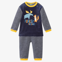 Little girls pink and blue trouser set by FS Baby, made from soft cotton jersey. The pink top has a cute deer appliqué with embroidered flowers and birds on the front. The blue, soft lightweight chambray trousers have pockets on the sides, and a comfortable, elasticated waistband.