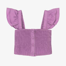 Girls white shirred top by Fun & Fun Chic. Pretty and feminine, it is soft and stretchy on the front and back, with flutter sleeves and button fastenings.