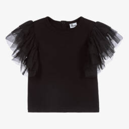 Stylish black jersey top for girls by The Tiny Universe, made from soft organic cotton. It has lovely ruffled tulle sleeves for a stand-out look in both casual or smart occasions. It fastens with poppers on the back.