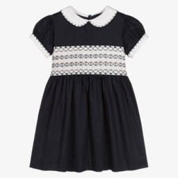 Girls navy blue cotton dress by British designer Rachel Riley. Beautifully hand-smocked and embroidered across the bodice, it has a white Peter Pan collar and cuffs, trimmed in blue for a traditional heritage look. Fully lined for comfort, it fastens at the back with buttons and has a sash that ties in a bow.