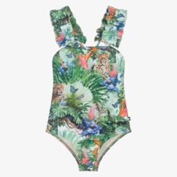 Patterned in a vivid jungle design, this green swimsuit for girls by Molo features silky, stretchy fabric with sun protection. The one-piece is stylish with long sleeves and a front zip, ensuring ease of wear. Perfect for summer escapades, it combines fashion and functionality. Dive into limited quantities available for a unique swimwear experience.