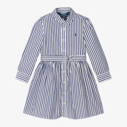 This pink and blue rugby dress by Ralph Lauren is a charming addition to any little girl's wardrobe. Made in soft cotton jersey, it features classic rugby stripes with a contrasting white collar and a playful ruffle hem. The iconic polo pony logo is embroidered on the chest for a signature finish.