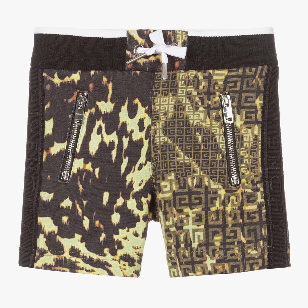 Baby boys Bermuda length shorts from luxury brand Givenchy Kids, with a green and black 4G camouflage print. Made in soft and comfortable cotton jersey, they have a black ribbed waistband and drawstring tie with branded end caps. They have embroidered black grosgrain side trim and branded silver zips on the front pockets.