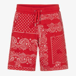Red swim shorts for baby boys by luxury French brand Givenchy. Soft and smooth, they have a white logo print around one leg and the designer's signature 4G logo printed in white on the back pocket. There are front pockets and a useful drawstring waist.