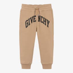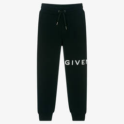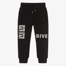 Comfortable black cotton Mini-me joggers for boys by French luxury brand Givenchy, made in mid-weight jersey. There are handy pockets on the front and back, as well as an elasticated drawstring waist for a good fit. They have a large white wrap-around logo print on one leg and the iconic 4G logo on the back.