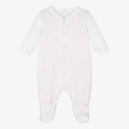 White and pale grey babygrow by Givenchy for boys and girls, printed with a signature 4G logo design. Fastening with poppers for easy dressing, this luxury babysuit is made in soft cotton jersey, ideal for babies delicate skin.