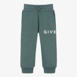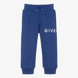 Blue joggers for teen boys by luxury French brand Givenchy, as seen in the main collection. They have a white logo print wrapped around one leg and the brand's signature 4G logo print in white on one back pocket. Made in mid-weight cotton sweatshirt jersey, they have a fleecy inside for extra warmth. They have front and back pockets and a useful drawstring waist, with silver branded end caps, for a comfortable fit.
