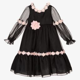 Gorgeous fuchsia pink satin dress for girls by Spanish designer Graci, with a chiffon overlay. Decorated with black chiffon and lace flowers, it has sheer chiffon sleeves that are full from the elbow down and have gently elasticated and frilled cuffs. There is a detachable black floral corsage below the bodice and a tulle frill on the cotton voile lining for extra volume.