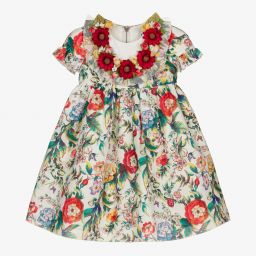 A beautiful special occasions dress for baby girls by Graci, with a multicoloured vintage floral design on a green background. Crafted from soft lightweight cotton with a comfortable lining, there are pretty detachable red faux flowers around the bib front and frilly short sleeves.