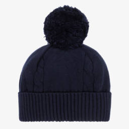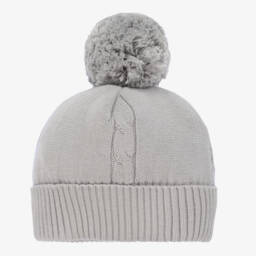 Grey hat for baby boys and girls by Emile et Rose, knitted in soft cotton. Cosy and warm, it has a lovely cable kit design, a large pom-pom on the top and a sweet turned-up brim.