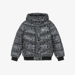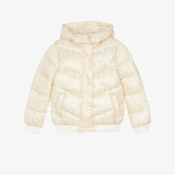 Beige puffer jacket for older girls by Guess, featuring an all-over double question mark logo design for instant brand recognition. Providing warmth and comfort, this padded jacket has a fixed hood, front pockets, and stretchy ribbed trims. It fastens with an exposed branded zip, with an additional popper fastening placket for extra cosiness.