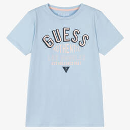Yellow T-shirt for teen boys from Guess, made in soft cotton jersey. The front is printed with a raised pale blue logo with a Triangle detail beneath. It contains organic cotton fibres.