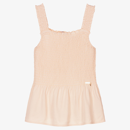 White vest top for teen girls by American brand Guess, made in soft, lightweight viscose. It has a stretchy shirred bodice and shoulder straps, with a deep, gathered hemline. There is a gold metal logo charm sewn on the waist.
