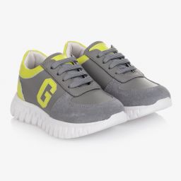 Teen boys white lace-up trainers by Guess, with leather uppers. There are lime green trims and a matching G logo on the side. They have a stylish suede leather toe cap. There is a soft textile lining with a comfortable leather footbed. They also have a white non-slip rubber outer sole.