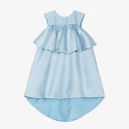 Exclusive to Childrensaon, a gorgeous pale blue special occasion dress for girls by Hucklebones London, made in soft, mid-weight satin twill. This elegant, sleeveless design has a deep ruffle trim on the chest and an eye-catching, oversized, glittery gold bow on the back. It has a discreet, concealed zip fastening and a stylish dipped hem on the back, with a soft satin lining for comfort.