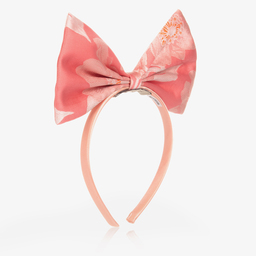 Pink hairband for girls by Hucklebones London. Covered with silky satin, the flexible band is decorated with a pretty bow, made in soft jacquard with a green and pink floral pattern.