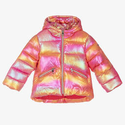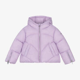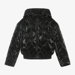 Black boxy fit puffer jacket for girls by iDO Junior, great for keeping warm when colder days arrive. It has a zip fastening on the front with poppers and elasticated cuffs to keep out the cold. This stylish, matte style has a trendy oversized popper on the neckline and silver logo charm on one sleeve for a branded finishing touch.