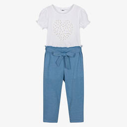Pretty ivory and gold trouser set for girls by Italian brand iDO Baby. The cotton jersey T-shirt has heart-shaped daisy appliqués with gold embroidery and elasticated frilly sleeves. Knitted in metallic viscose with a soft jersey lining, the trousers have a stretchy paperbag waist and a fixed tie belt.