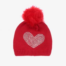 Girls navy blue knitted hat by iDO Baby, made from a blend of wool and cotton With a large faux fur pom-pom on top, it has a sparkly silver diamanté heart logo on the front and ribbed trim.