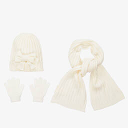 A lovely terracotta pink knitted hat set for girls from iDO Baby. The chunky knit beanie hat has a fixed fold-over brim with a sweet bow stitched above. The matching gloves and scarf complete this cosy set, lovely for a chilly day.